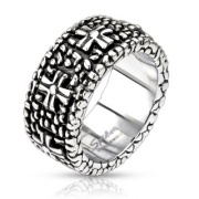 Bague homme acier à reliefs moyenâgeux et pierre rouge