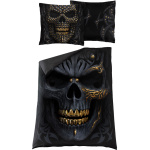 La tête de mort sombre est décorée de nombreux ornements dorés, dont des motifs ancestraux.