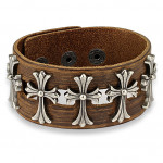 Chaque croix celtique qui orne ce bracelet est un hymne à la symétrie et à la précision, leurs bras égaux finissant en élargissements majestueux qui capturent l'oeil et emprisonnent la lumière. Le contraste entre le noir abyssal du cuir et l'éclat argenté du laiton forge une alliance entre ombre et lumière, entre passé et présent, te propulsant au-delà des simples mortels dans le panthéon de ceux qui osent défier les convenances.
