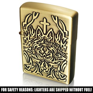 Briquet tempête avec loup stylisé et croix en métal cuivré