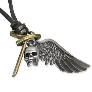 Collier avec cordon de cuir et tête de mort avec aile en pendentifs