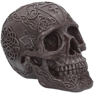 D'abord, une croix latine recouvre l'os frontal : les reliefs réguliers semblent indiquer que le défunt portait un genre de masque à son effigie, cachant ainsi la partie des yeux. Plusieurs triquetras entrelacées et discrètes ont été taillées, à même la matière. D'élégants dessins rappellent le disque d'Auvers, grâce à des motifs curvilignes et incrustations arrondies. En résulte un artefact magique, protégé par l'héritage de peuples puissants et civilisations fascinantes, qui ne laissera personne indifférent.