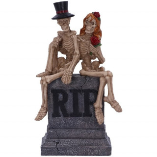 Cette figurine unique à l'effigie d'un couple de squelettes unis dans la mort vous évoquera vos rendez-vous galants au Père-Lachaise. Deux silhouettes se tiennent sur une stèle qui rappelle le granit. L'état de la sépulture à l'abandon ne suffit pas à effacer les trois lettres « RIP » : Rest In Peace : Repose En Paix. À gauche, tout porte à croire qu'il s'agit d'un homme. Le sommet de son crâne a été recouvert d'un chapeau haut de forme. À ses côtés, une femme tient une rose entre ses doigts décharnés. Le squelette chevelu arbore de beaux reflets roux et croise les jambes, dans une posture très féminine.