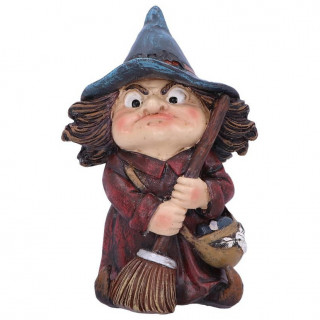 La sorcière semble tenir fermement son balai, symbole de son pouvoir et extension de sa volonté. Sa besace beige, ornée de fermoirs argentés et d'un motif de crâne mystérieux, attise la curiosité et invite à explorer plus en profondeur l'univers de cette sorcière atypique mobilisée par Nemesis Now Design.