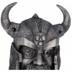Le visage d'un guerrier sévère, doté de longs cheveux tressés et d'une barbe complexe, t'interpelle, te forçant à respecter le lieu sacré qu'il est chargé de protéger. Son regard énigmatique, accentué par trois orbes disposés judicieusement comme pour symboliser une forme obscure de commandement, t'envoûte. Le casque, couronné de deux cornes pointues recourbées vers le ciel, est un chef-d'oeuvre en lui-même, avec des motifs celtiques d'une symétrie parfaite. Tu ne peux qu'admirer le contraste saisissant entre la corne usée et l'autre intacte, comme si elles témoignaient des batailles passées.