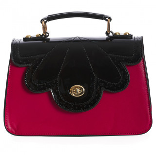 Sac à main style cartable rouge avec rabat à motif floral noir verni