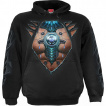 Le tableau principal sur la façade de ce sweat créé l'illusion d'une poitrine où la chair s'écarte, révélant une mécanique complexe. Un oeil électronique bleu, véritable joyau scintillant comme un saphir, prend place où aurait dû être le sternum, entouré de structures à l'allure de vertèbres et de côtes mécanisées. Recouvrant toutes ces merveilles techno-organiques, une peau synthétique dont la réalité frappe autant qu'elle fascine.