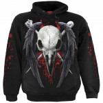 Au dos, l'ombre se fait totem: un crâne de rapace, ailes déployées, se dresse devant une nuée écarlate, toujours escorté par ossements et pieux rituels. L'artiste puise clairement dans les mythes du corbeau psychopompe, messager des champs de bataille et passeur d'âmes: avant et arrière racontent le passage, du visage humain au masque de l'oiseau, comme une métamorphose funeste.