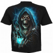 Au dos du vêtement, la Mort revient pour une performance de face. Dans sa main ouverte, une sphère lumineuse jaillit, éblouissant l'oeil de l'observateur. Les couleurs, évoquant celles du recto, intensifient le thème gothique et métal du design, donnant à ce t-shirt une allure résolument audacieuse et rebelle.