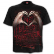 Sur fond noir, ce tee-shirt qui inspire à la fois un élan de solidarité et votre passion pour le gore représente deux mains osseuses qui se rejoignent, pour former un adorable c½ur. Oh, rassurez-vous, point de niaiserie ici : un mur couvert de briques a été souillé par des écritures qui forment ces mots : « WE BLEED TOGETHER » : nous saignons ensemble !