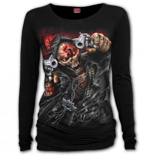 Au poteau central de ce chef-d'oeuvre se tord un crâne, hyper-réaliste, aux yeux rouges ardents. Mon imagination dépeint un guerrier d'une ancienne ère, réincarné en cette effigie maculée d'un sang mystique. A ses côtés, une main squelettique saisit deux revolvers fusionnés en croix, indiquant un brasier qui ne s'éteint jamais. Les lettres "5FDP", tatouées nonchalamment entre les jointures effilées, sont autant une signature du maître que de la collection elle-même.