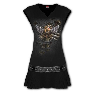 Alors, ma disciple, n'est-ce pas une pépite tout droit échappée de mon Antre ? Laisse ton coeur s'emballer au rythme des engrenages et viens revendiquer ton goût pour le gothique, le steampunk et le rock en te parant de cette tunique minijupe. Offre-toi cette pièce unique, elle n'attend que toi. Le noir est une couleur qui te va si bien...